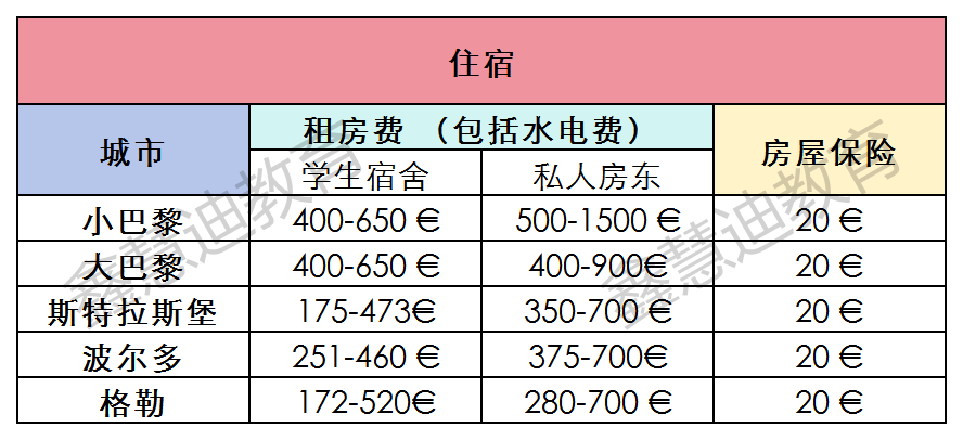 今天小编将主要从「住宿,交通,食品消费,学费,医疗,日常消费」等方面,对巴黎,斯特拉斯堡,波尔多,格勒这四大城市的留学费用进行详细对比。