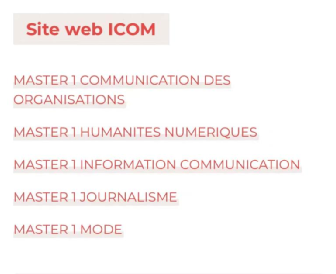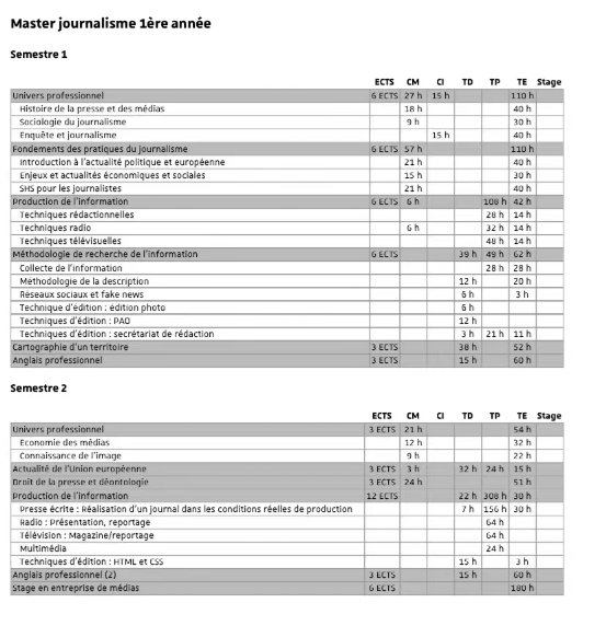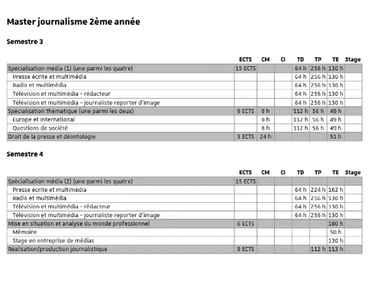-硕士第一年课程:第一年开始时,学生要进行一个融入性实习。第一年的课程主要是基础课程和补充课程(编辑工作会议、涉及不同主题的大课)、专门的职业训练课(新闻写作、英文写作、英语国家新闻准则介绍、声音训练)。